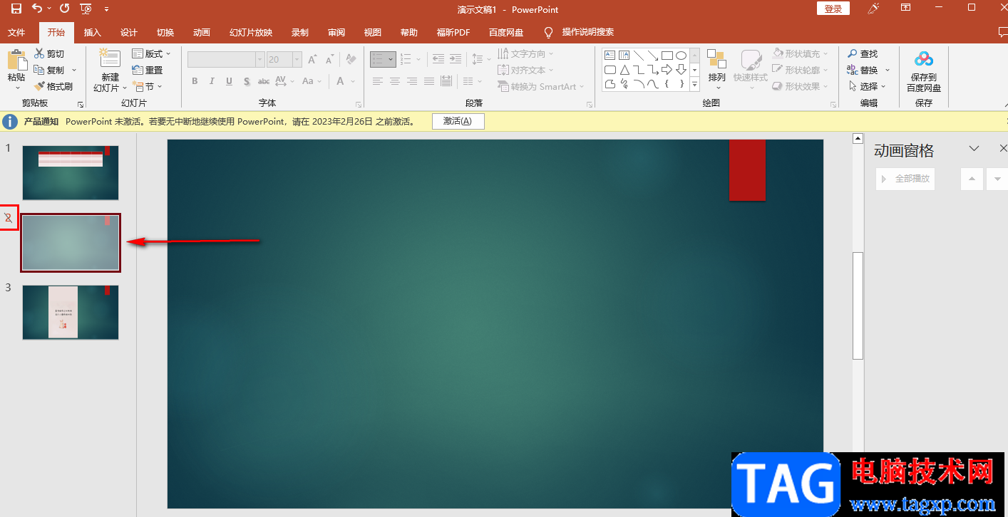 3.当你隐藏了第二长得幻灯片之后,你会看到该幻灯片颜色就会变成灰色,并且前面的2数字也是被划掉的。