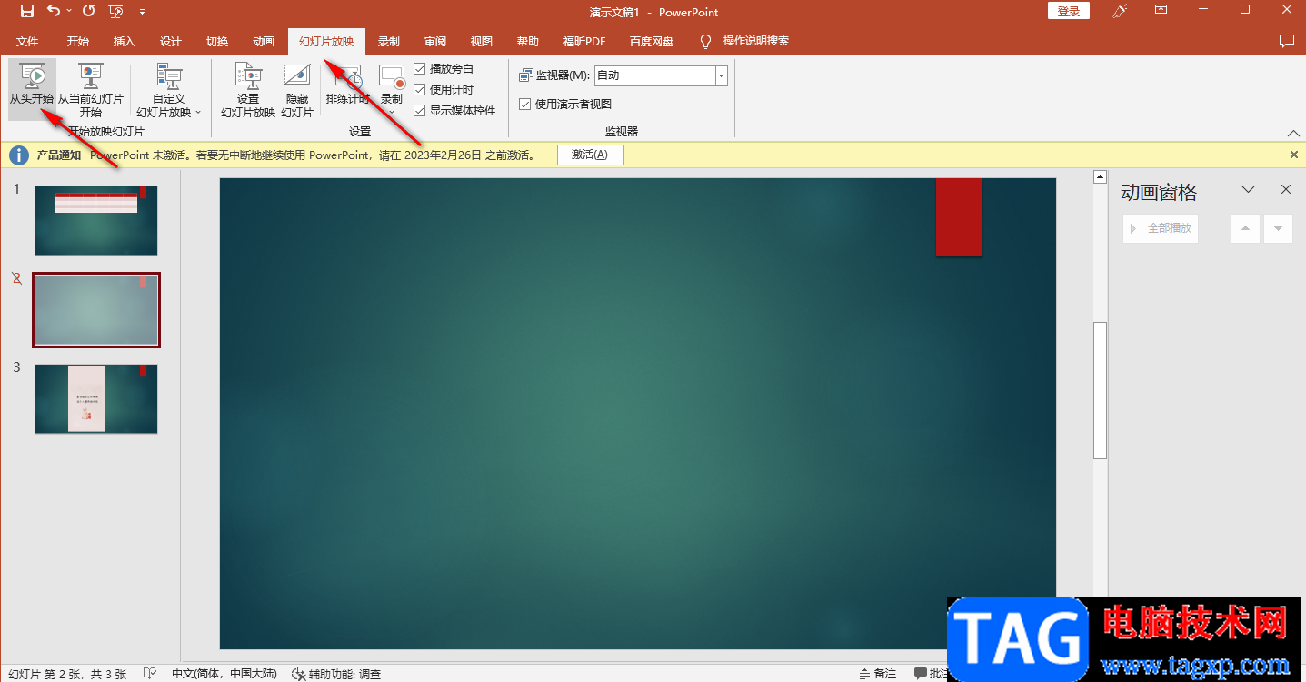 4.这时我们再点击一下上方的【幻灯片放映】选项卡,然后在左侧方向点击一下【从头开始】按钮进行播放幻灯片。