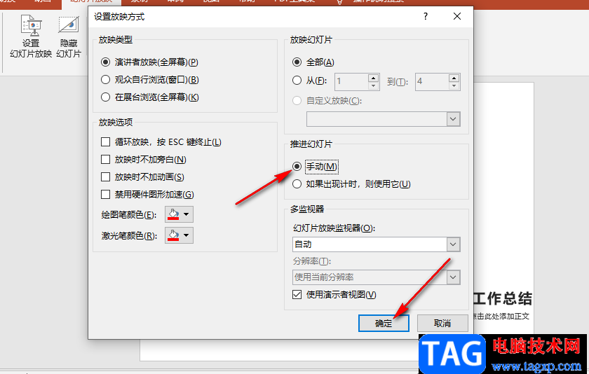 4、第四步,在幻灯片放映设置页面中我们在“推进幻灯片”选项的下方将选项改为“手动”,然后点击页面下方的“确定”选项即可