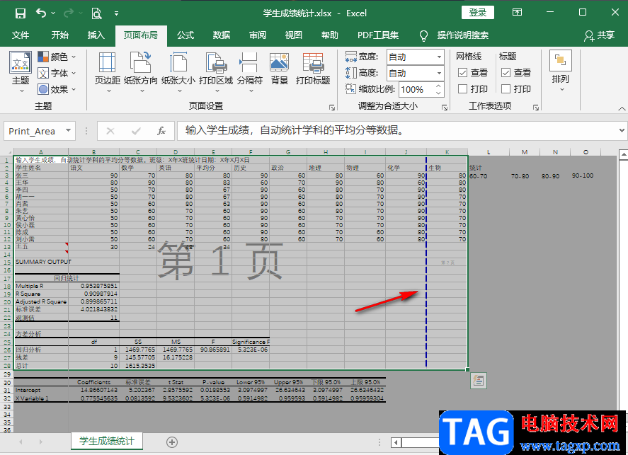 3、第三步,接着我们在页面布局的子工具栏中找到“打印区域”选项,点击该选项下方的箭头,然后在下拉列表中选择“设置打印区域”选项