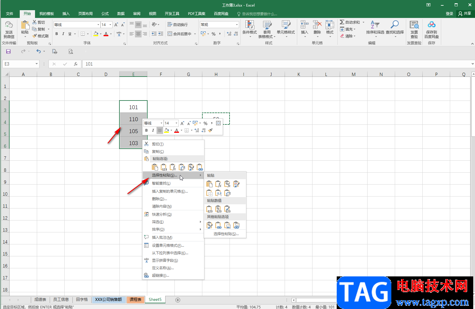 第三步:接着选中需要统一减去数字的数据组,右键点击一下后在子选项中点击“选择性粘贴”;