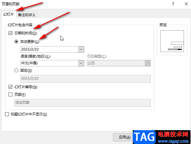 第三步:打开窗口后,在“幻灯片”栏,点击勾选“日期和时间”并选择“自动更新”;