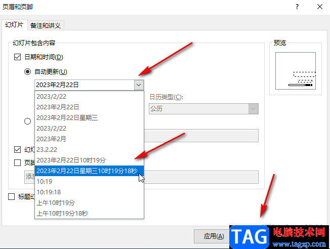 第五步:然后点击“自动更新”处的下拉箭头,选择想要的日期格式,并点击“全部应用”(应用于所有幻灯片页)或者点击“应用”(应用于当前幻灯片页)按钮就可以了,后续可以在界面右下方看到添加的日期,如果有需要可以适当调整位置。