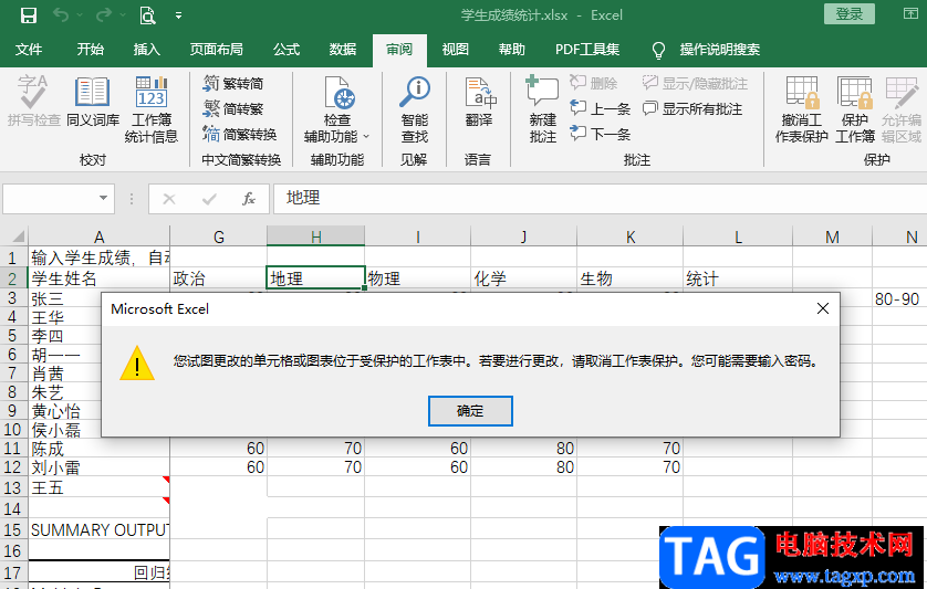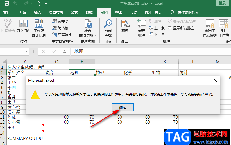 5、第五步,点击确定选项之后我们在弹框中再确认一次密码就可以将单元格进行锁定了,接着我们再点击单元格进行编辑,页面中就会出现如图所示的弹框,表示无法进行编辑,这里需要注意的是表格中的所有单元格默认都是锁定,所以我们的这一操作可能会锁定所有的单元格