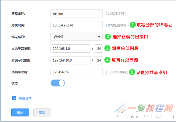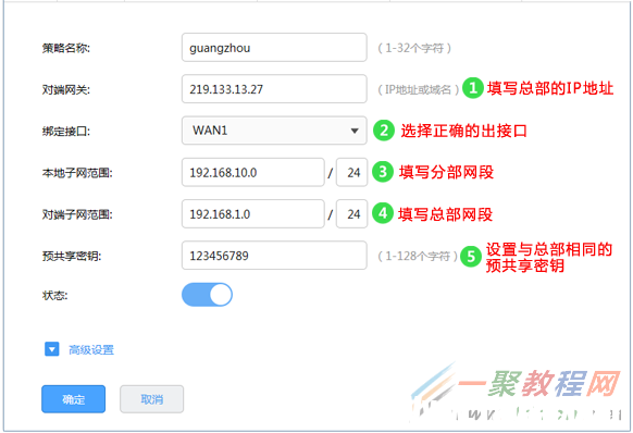 绑定接口:即总部使用哪个接口与分部对接,请选择连接宽带的接口。 其他设置保持默认,保存设置并点击界面右上角保存配置。 2、设置分部路由器的IPSec安全策略 分部IPSec安全策略恰好与总部策略对应,设置如下: