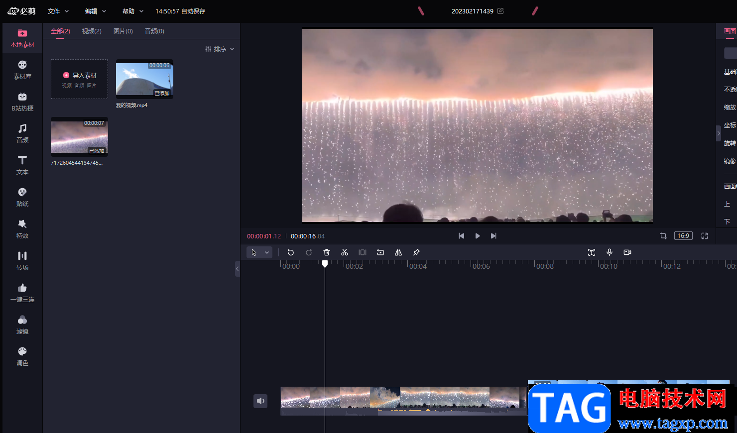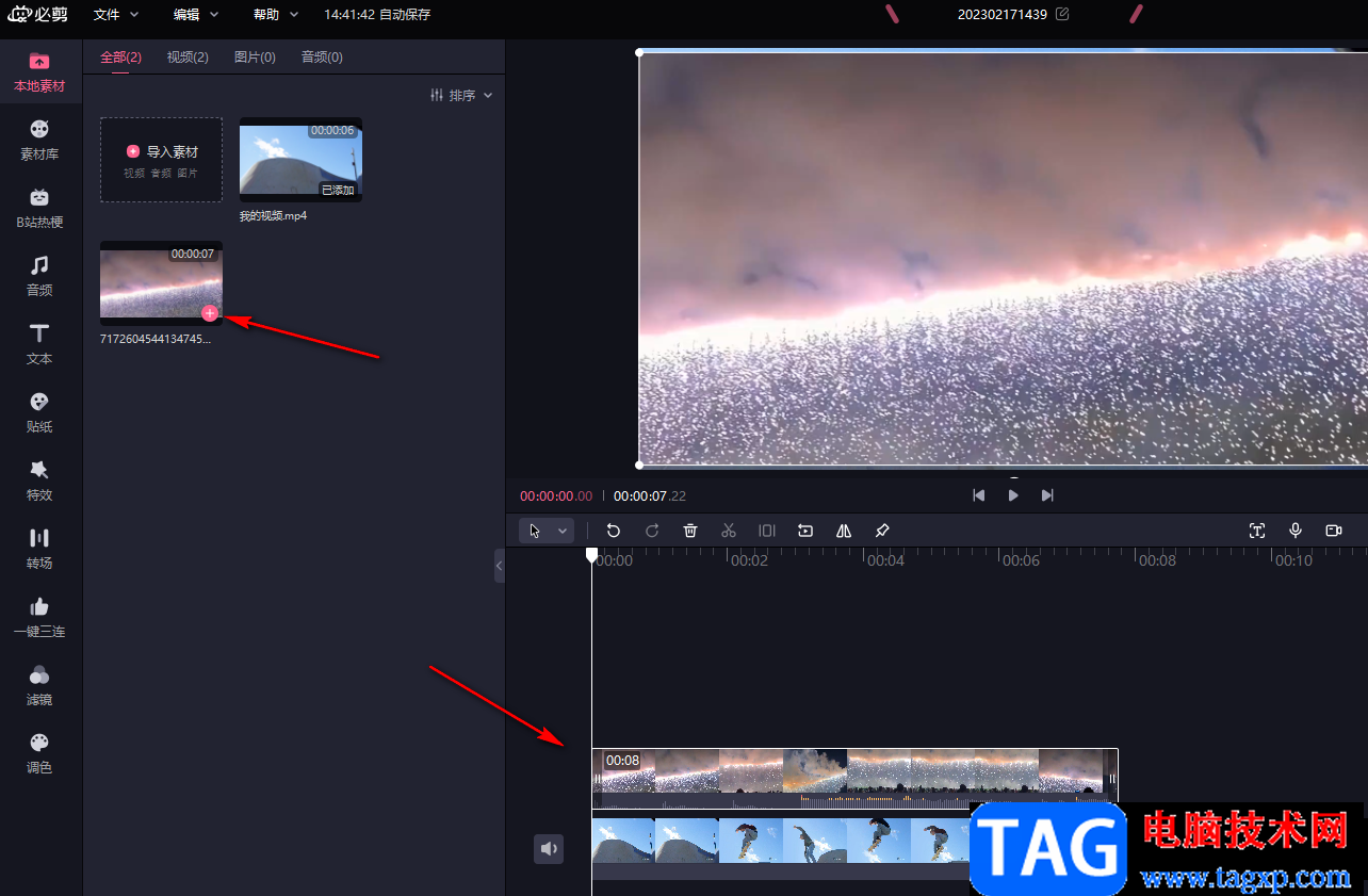 4、第四步,添加好视频之后,我们在本地素材页面中点击视频右下角的“+”图标,将视频添加到视频轨道中,可以看到当前两个视频是分别位于上下两个视频轨道中的,这代表他们的视频画面是重合的