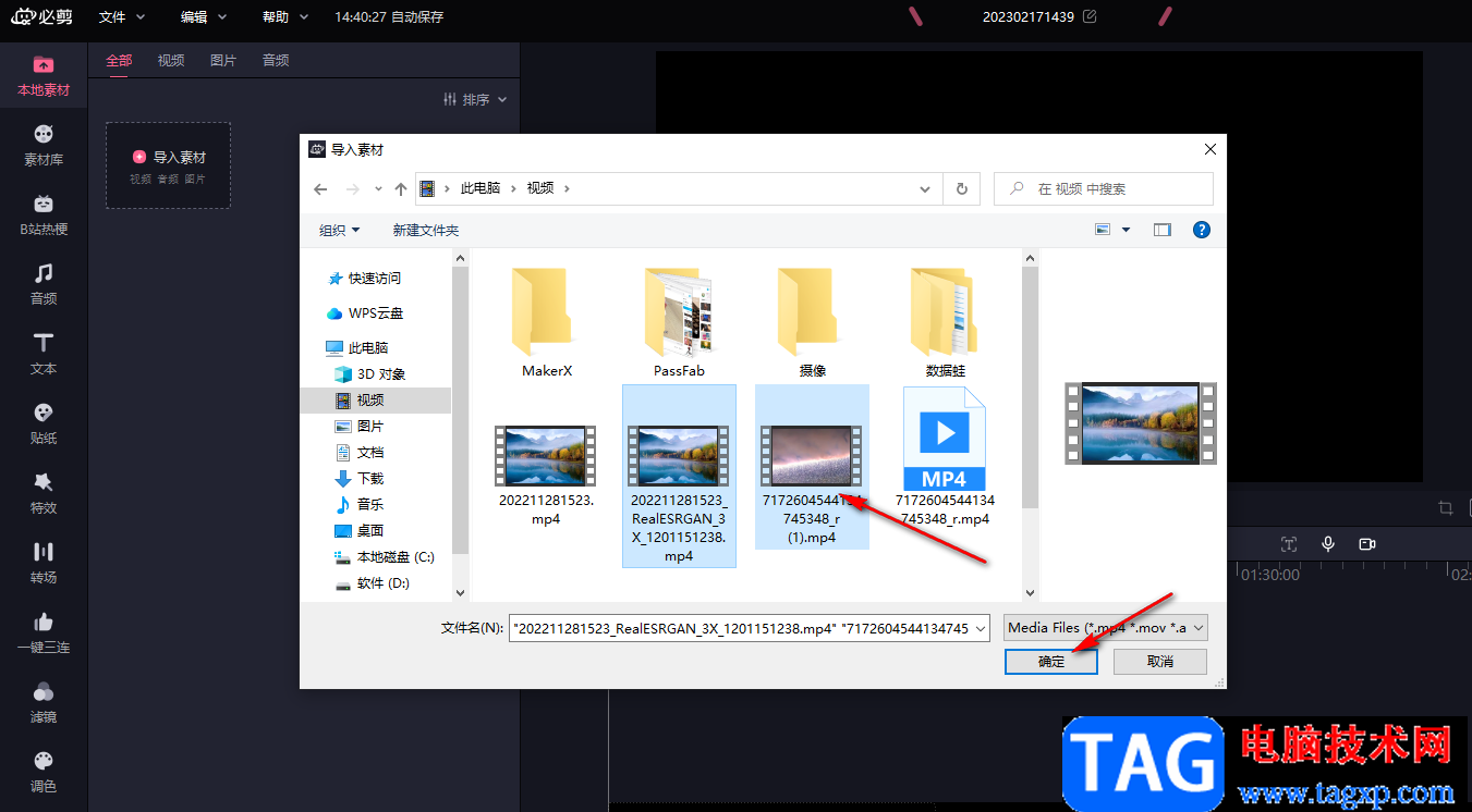 3、第三步,进入文件夹页面之后,我们在该页面中找到自己需要的素材文件,可以按住“Ctrl”键然后选择两个及以上的视频素材,选中之后点击“确定”选项