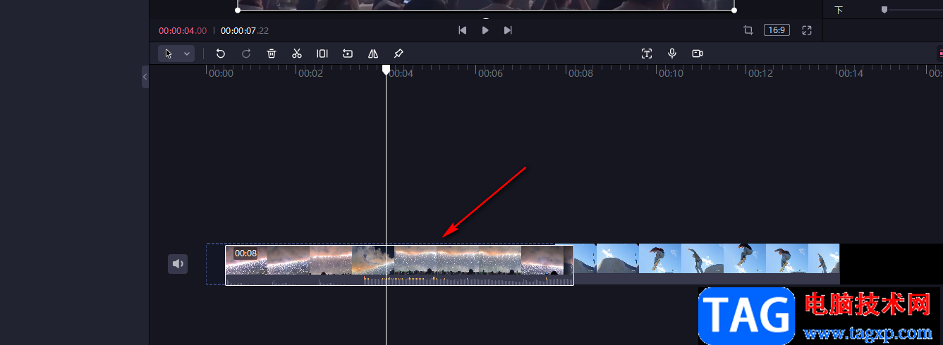 5、第五步,想要将两个视频合并为一个,我们可以将上面的视频拖动到下方的轨道中,它会自动吸附到第一个视频的后面,如果我们想要更改两个视频的前后位置,我们也可以直接拖动一个视频到另一个视频的前方,它会出现一个虚线框,直接放在虚线框上即可