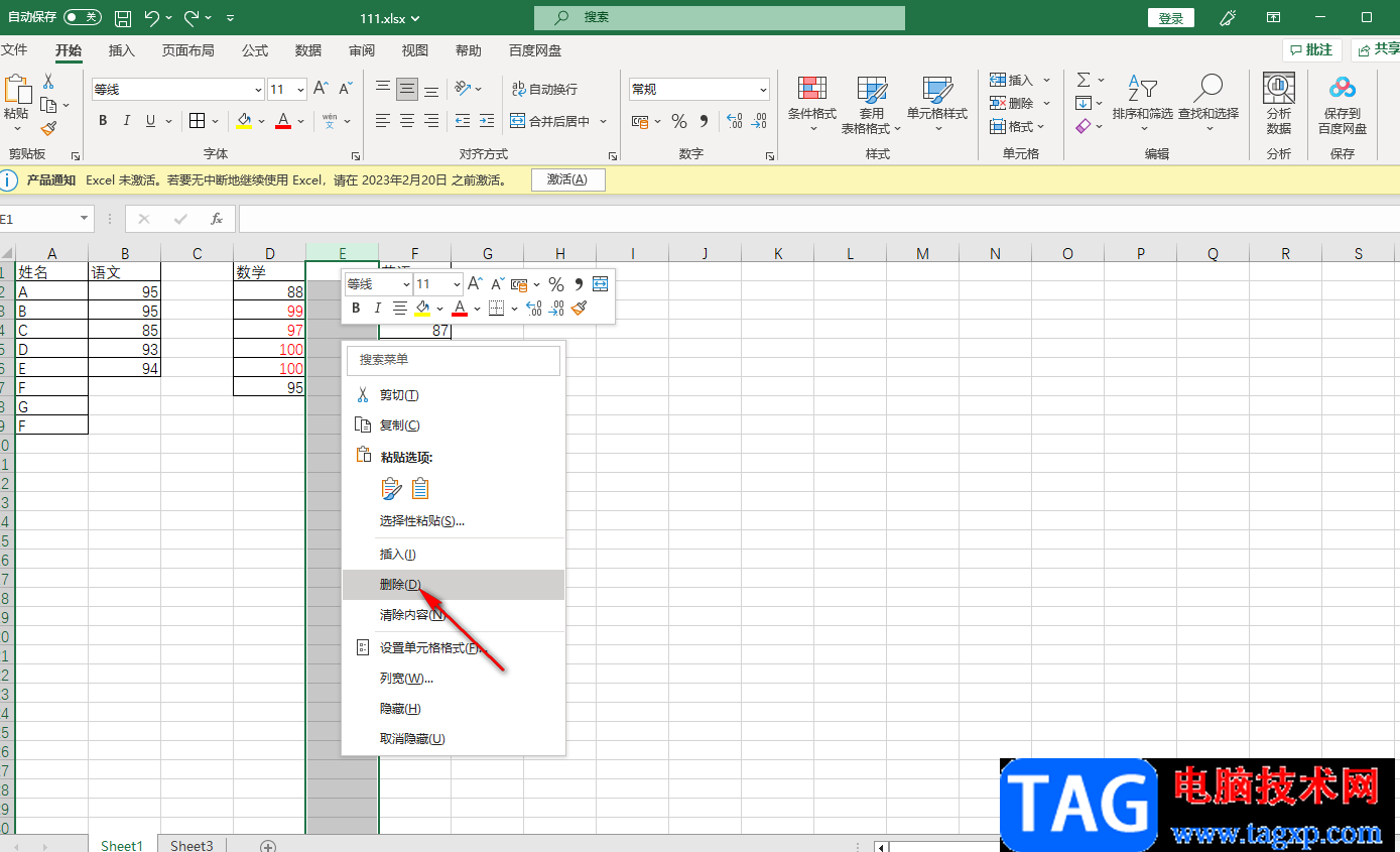 2.将空白的整列选中之后,然后再用鼠标右键点击一下,在打开的菜单选项中选择【删除】选项就可以了。