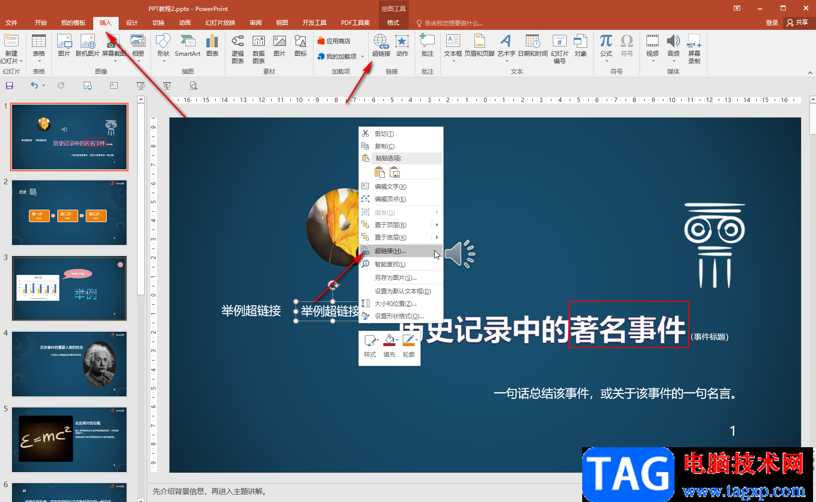 第三步:然后点击选中文本框,注意是选中文本框,不是选中文字,然后右键点击一下并在子选项中点击“超链接”,或者在“插入”选项卡中点击“超链接”按钮;