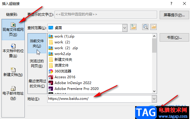 第四步:在打开的窗口中点击“现有文件或者网页”,然后在“地址”处输入想要访问的地址并进行确定;
