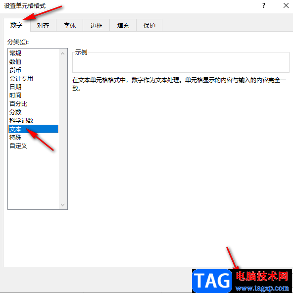第三步:进入设置“设置单元格格式”窗口后,在“数字”栏点击选择“文本”,然后点击“确定”;