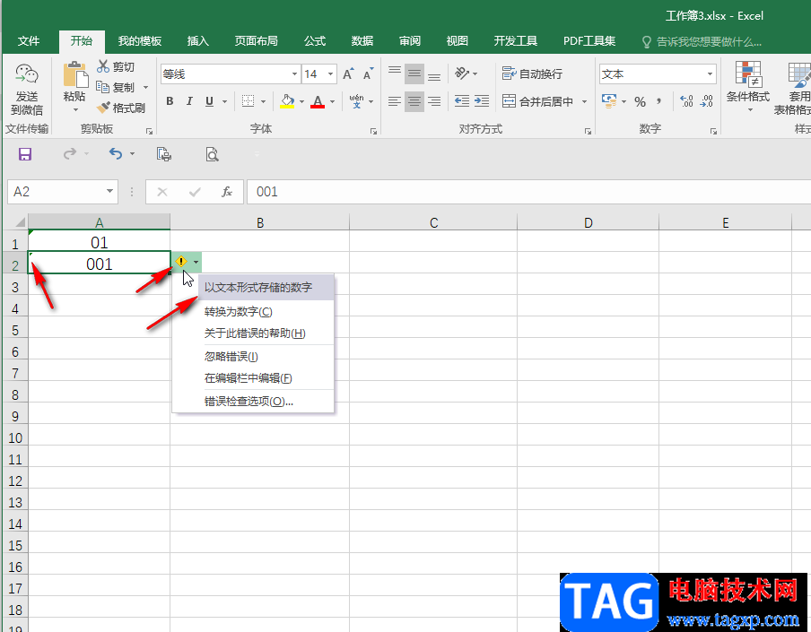 第五步:输入内容后可以看到左上方有一个绿色的小图标,点击选中单元格还可以看到出现了一个黄色的小图标,点击一下可以看到“以文本形式存储的数字”的提示。