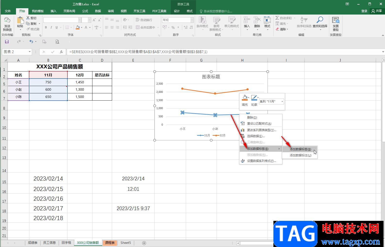 第三步:方法2.右键点击一下图表中的折线,在子选项中点击“添加数据标签”——“添加数据标签”就可以进行添加了;