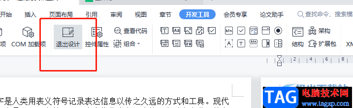3.这时用户需要在在菜单栏中点击开发工具选项,并在显示出来的选项卡中选择退出设计选项即可