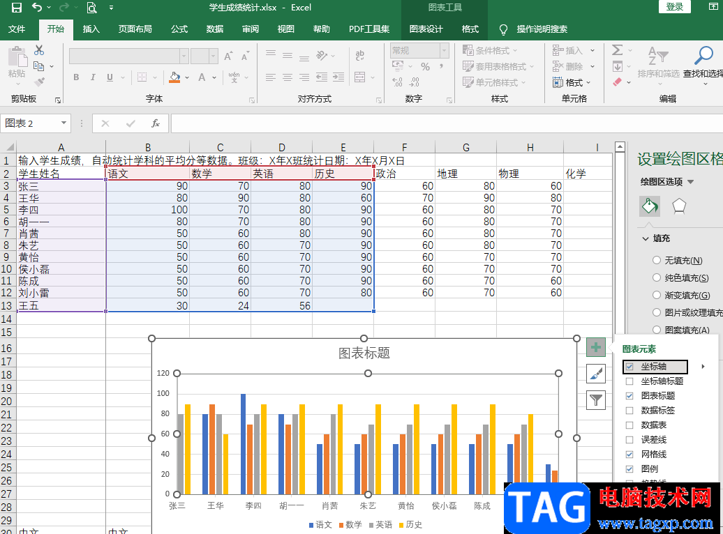 4、第四步,在表格中插入图表之后,我们双击图表中的横或纵坐标轴,就可以打开“设置坐标轴格式”页面,在该页面中我们可以更改坐标轴的类型、位置、刻度线、标签以及数字,还可以设置给坐标轴的内容设置填充、效果以及对齐方式