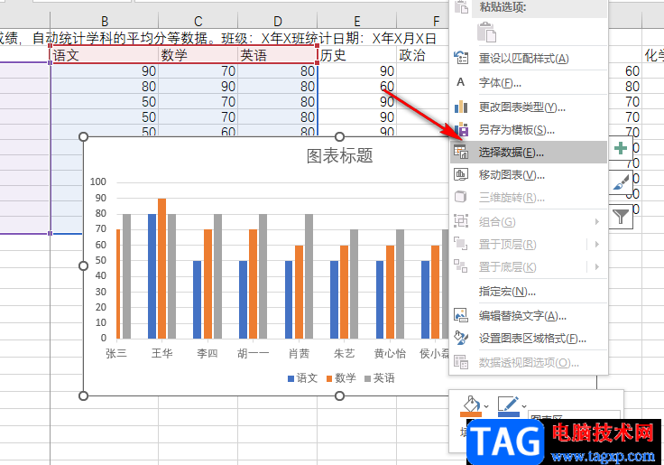 5、第五步,如果我们想要重新选择X轴的内容或是y轴的选区,我们可以右键单击图表,然后选择“选择数据”选项