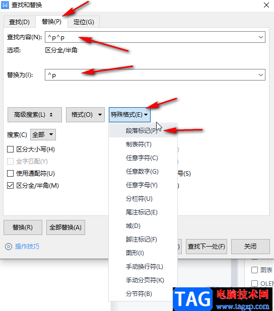 第六步:另外,我们还可以按Ctrl+H打开查找和替换窗口,在查找内容处输入两个段落标记,在“替换为”处输入一个段落标记,然后点击“全部替换”,这样也可以实现删除空行的效果。