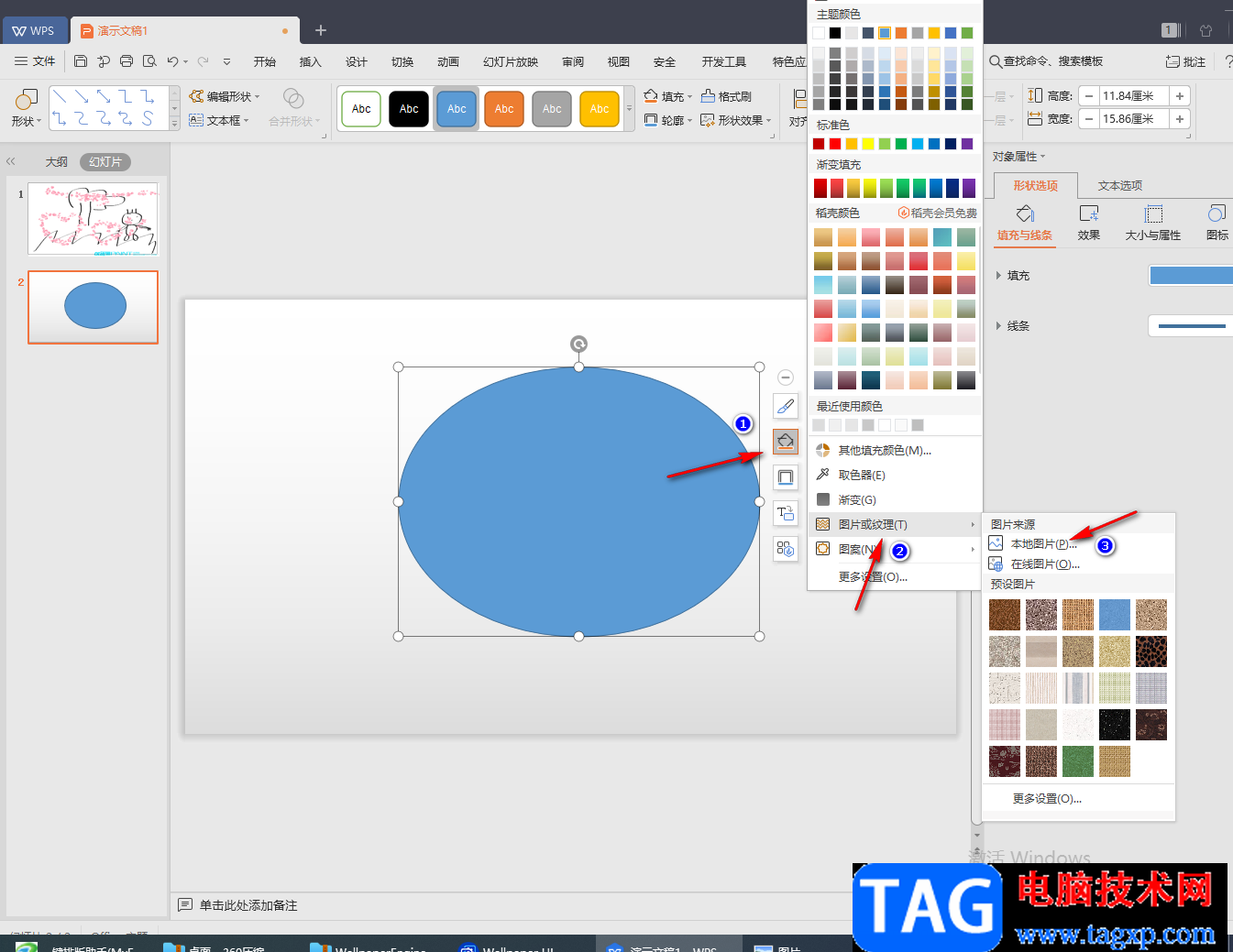 3.这时我们将鼠标放在图形上,然后在图形的右侧有一个填充的图标,点击该图标就会弹出一个颜色窗口,在该窗口中选择【图片或纹理】,然后再选择【本地图片】。