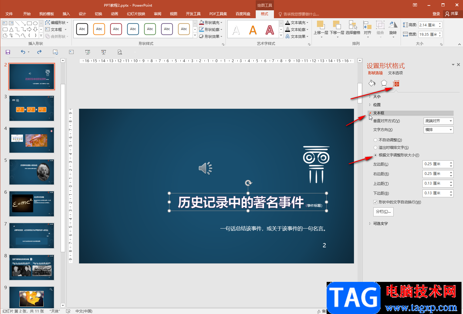 第六步:我们也可以点击选中文本框后点击“格式”,然后点击“大小”栏右下角的小图标打开侧边栏进行同样的设置,在侧边栏中我们还可以根据实际需要设置是否在形状中文字自动进行换行。