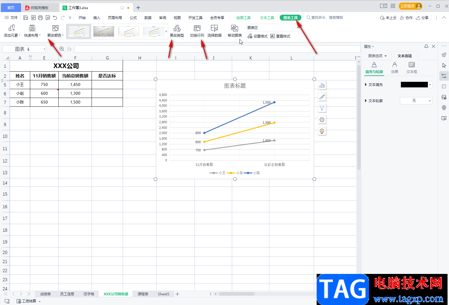 第五步:在上方的“图表工具”选项卡中,还可以使用“切换行列,更改类型,更改颜色,快速布局,添加元素”等功能;