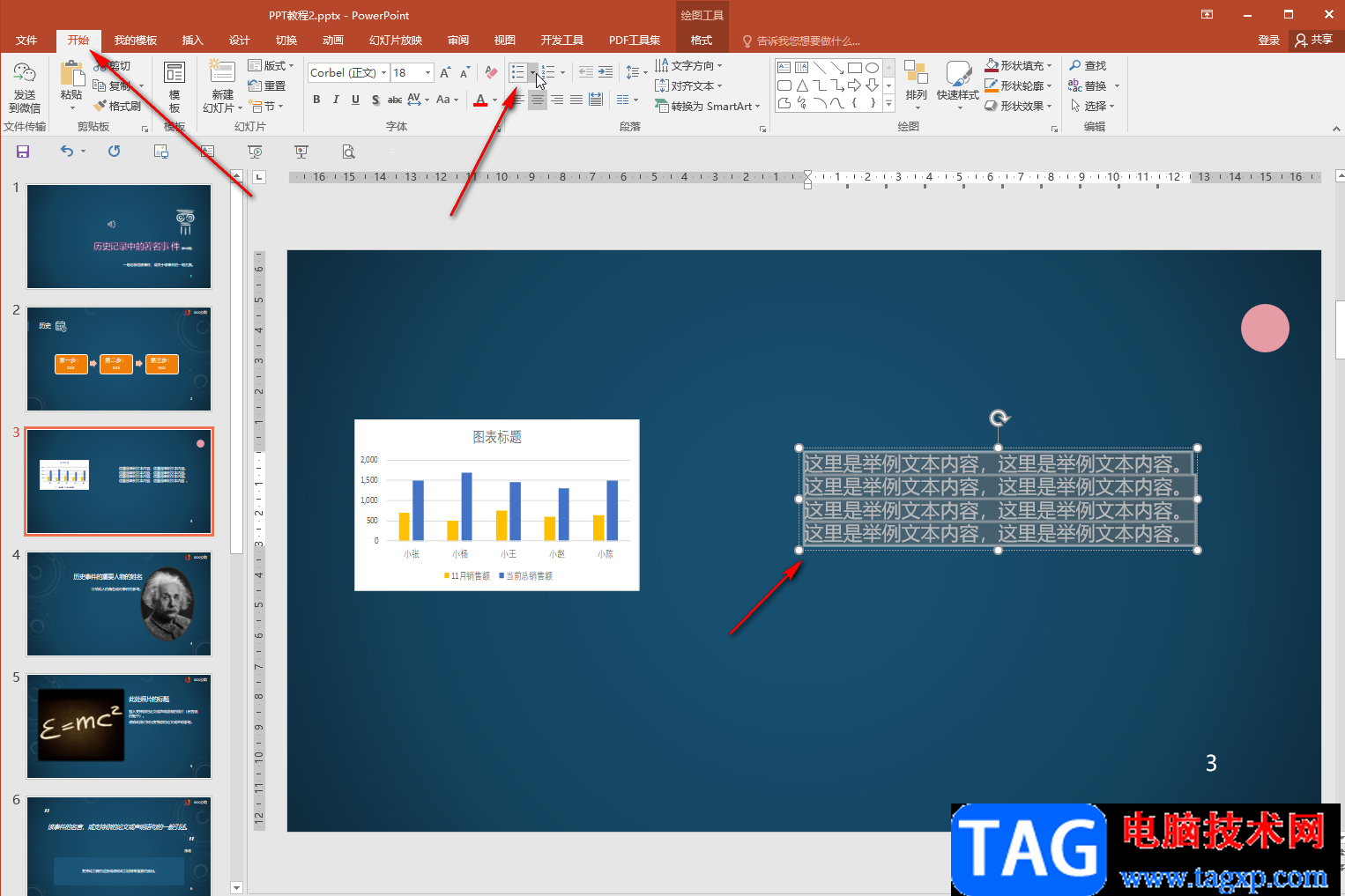 第二步:选中需要需要添加的文字部分,在“开始”选项卡中点击如图所示的“项目符号”处的下拉箭头;