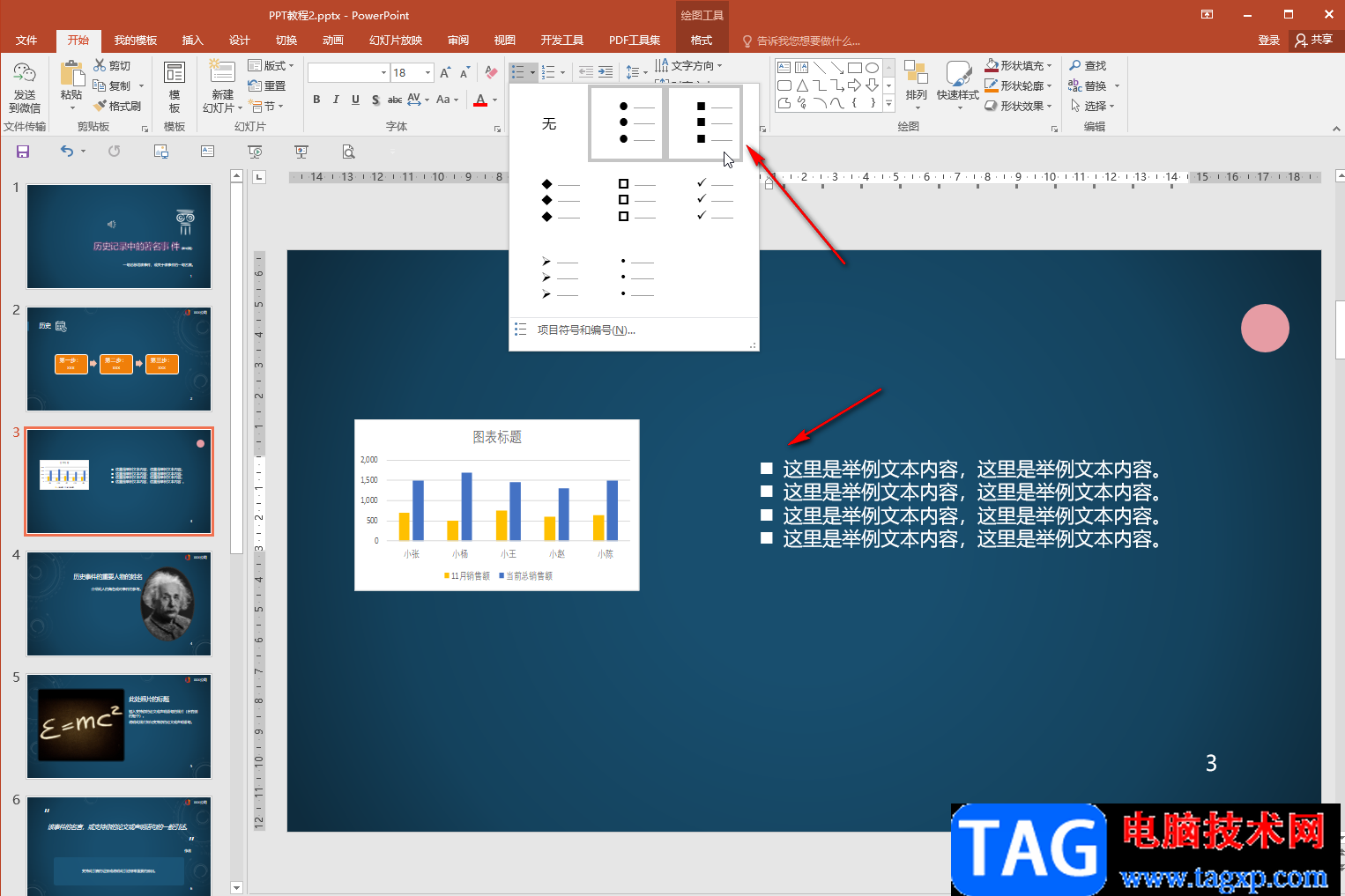 在powerpoint演示文稿中编辑较多的文字内容时,我们可以在不同的段落前添加一些项目符号,比如我们可以在文字前面添加一些小圆点,小方块,勾符号等等,这样可以帮助我们更好地分开不同段落,方便查看。如果我们需要在文字前面添加小圆点,小伙伴们知道具体该如何进行操作吗,其实添加方法是非常简单的。我们只需要选中内容后在“开始”选项卡中点击“项目符号”图标就可以在子选项中进行添加了。如果有需要我们还可以对项目符号进行个性化的设置,比如我们可以调整项目符号的颜色和大小,自定义其他想要的项目符号等等。接下来,小编就来和小伙伴们分享具体的操作步骤了,有需要或者是感兴趣的小伙伴快来和小编一起往下看看吧!