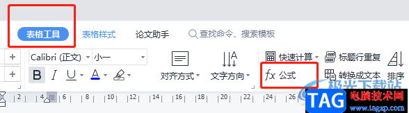 2.接着可以看到菜单栏中显示出来的表格工具,需要用户在下方选项卡中选择公式选项