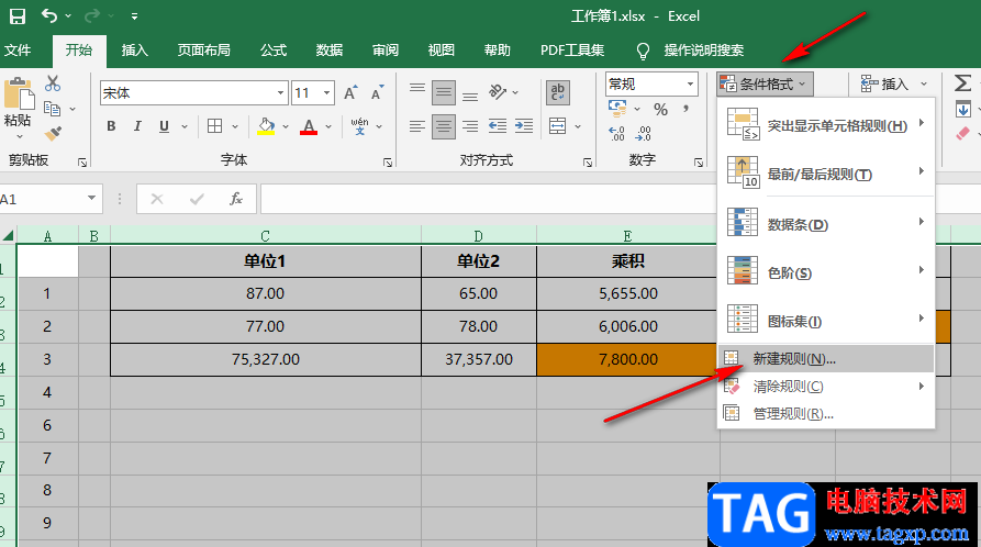 3、第三步,选中所有表格之后,我们在“开始”工具的子工具栏中打开“条件格式”工具,然后在下拉列表中点击选择“新建规则”选项