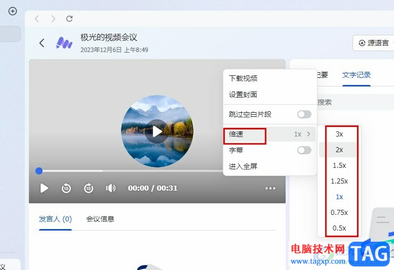 以上就是小编整理总结出的关于飞书在妙记页面中倍速播放会议视频的方法,我们打开飞书软件之后,在视频会议中打开妙记,再在妙记页面中点击打开一个会议视频,最后在视频页面中我们打开“...”图标就能进行倍速选择了,感兴趣的小伙伴快去试试吧。
