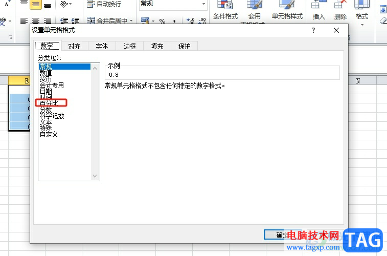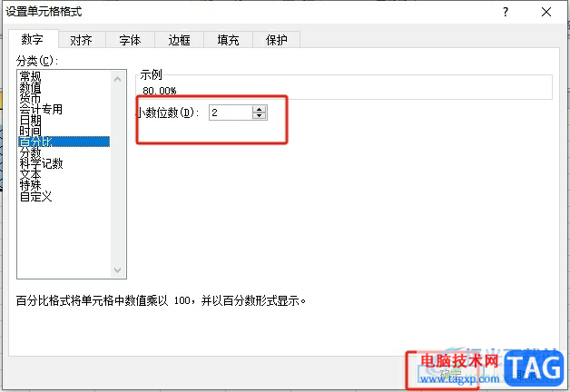 3.进入到设置单元格格式窗口中,用户在数字选项卡中,点击分类板块中的百分比选项