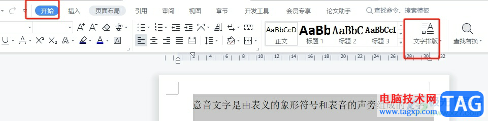 2.接着在页面上方的菜单栏中点击开始选项,将会显示出相关的选项卡,用户选择其中的文字排版选项