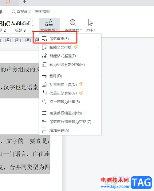 3.这时用户可以看到弹出来的下拉选项卡,用户选择其中的段落重排选项即可解决问题