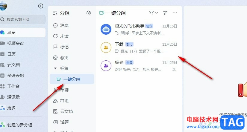 很多小伙伴在使用飞书软件的过程中经常会需要面对众多的群聊,当我们想要快速的将所有聊天消息按照一定的条件完成分类时,我们只需要在飞书的标签一栏中打开“+”图标,创建新标签,然后在创建标签的页面中再点击添加标签规则选项,添加标签规则,这里的标签规则也就是聊天消息自动分类的条件,设置好之后,我们在条件页面中点击保存选项,再在创建标签页面中点击创建选项即可。有的小伙伴可能不清楚具体的操作方法,接下来小编就来和大家分享一下飞书一键完成聊天分组的方法。