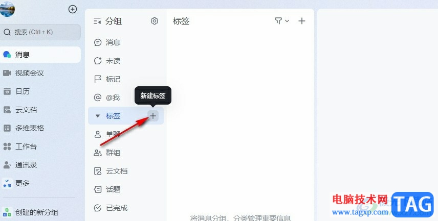 2、第二步,在消息页面中,我们点击“标签”右侧的“+”图标,也就是新建标签选项