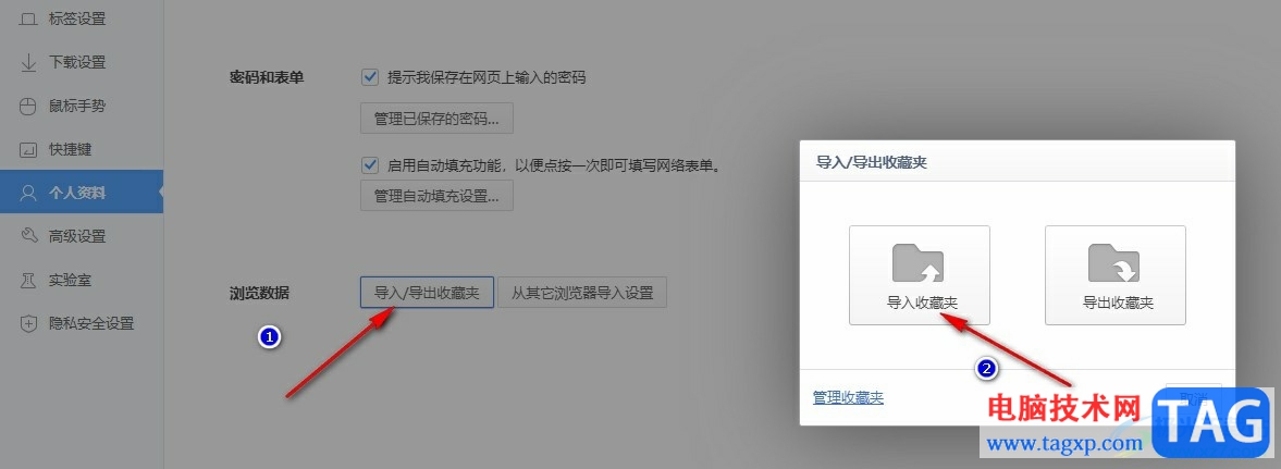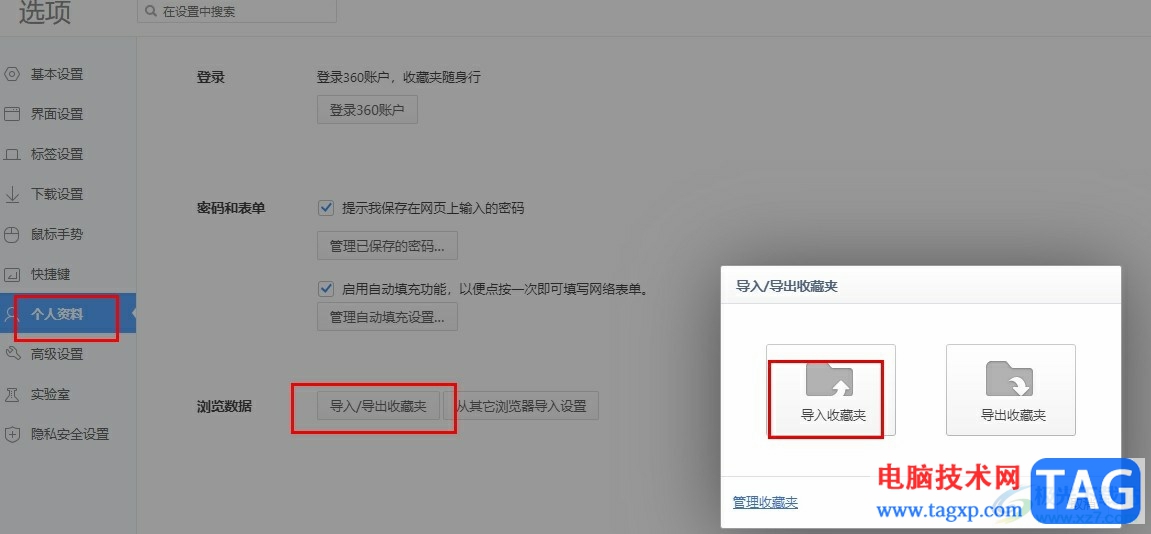4、第四步,在个人资料页面中,我们再点击“导入/导出收藏夹”选项,接着在弹框中点击“导入收藏夹”选项