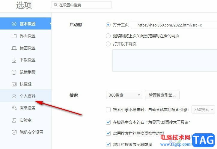 3、第三步,进入360极速浏览器的设置页面之后,我们在左侧列表中打开“个人资料”选项