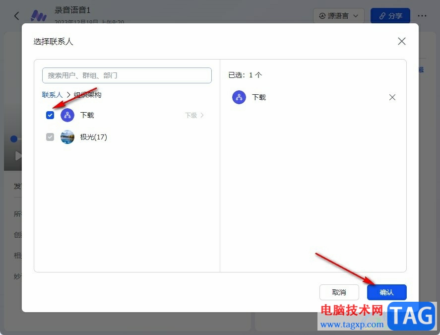 5、第五步,最后我们在选择联系人页面中点击勾选需要添加的联系人,再点击“确认”选项即可