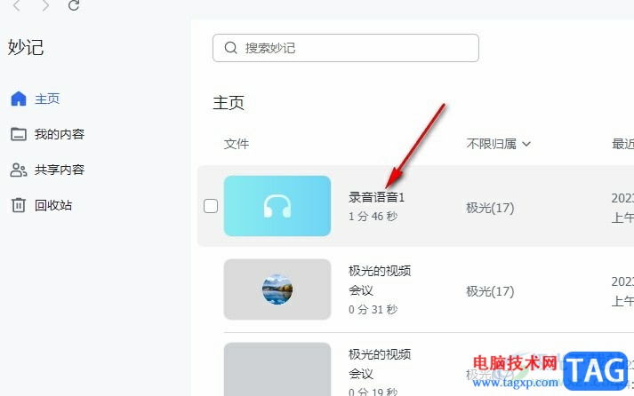 3、第三步,进入妙记页面之后,我们在该页面中打开一个需要添加协作者的视频