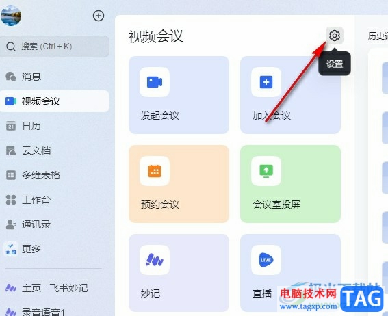 2、第二步,进入视频会议页面之后,我们在页面右上角找到设置图标,点击打开该图标