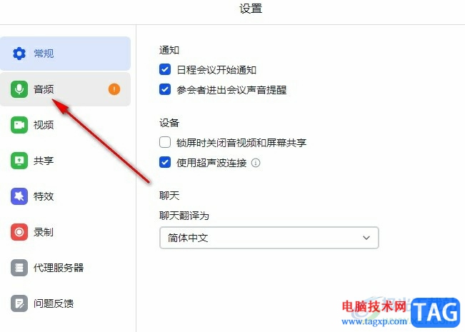 3、第三步,打开视频会议中的设置选项之后,我们在弹框中点击打开“音频”选项