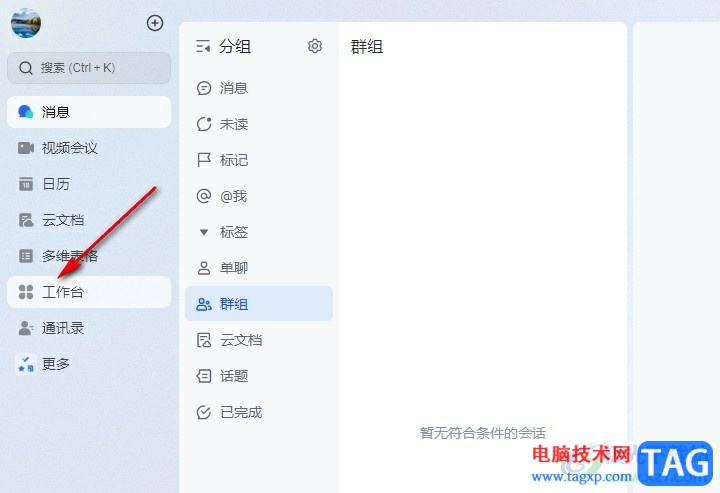 1、第一步,我们在电脑中点击打开飞书软件,然后在飞书的左侧列表中点击打开“工作台”选项