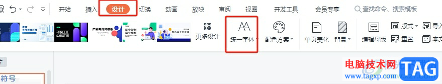 2.接着在页面上方的菜单栏中点击设计选项,将会显示出相关的选项卡,用户选择其中的统一字体选项