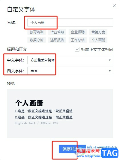 4.来到自定义字体窗口中,用户设置好名称、中文字体和西文字体后按下保存并应用按钮即可解决问题
