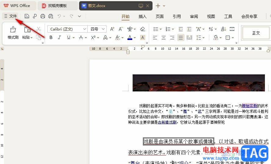 2、第二步,打开文字文档之后,我们在页面左上角打开“文件”选项