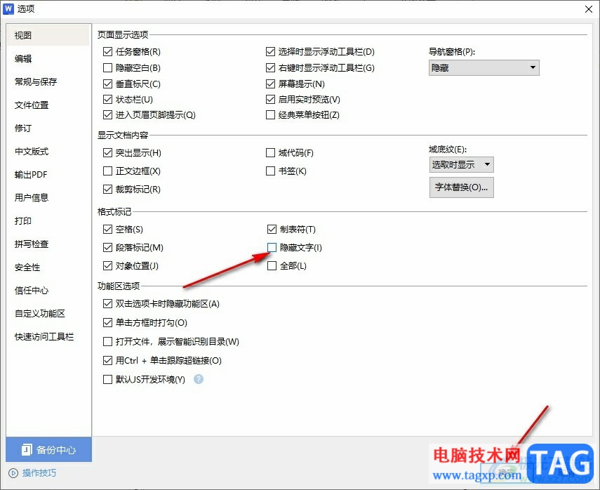 4、第四步,打开“选项”之后,我们在视图设置页面中取消勾选“隐藏文字”选项,再点击“确定”选项即可