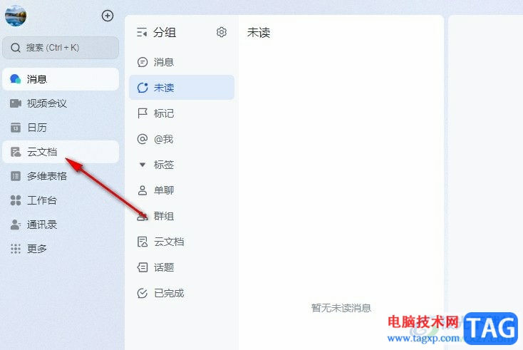 1、第一步,我们在电脑中点击打开飞书软件,然后在软件页面中点击打开云文档选项