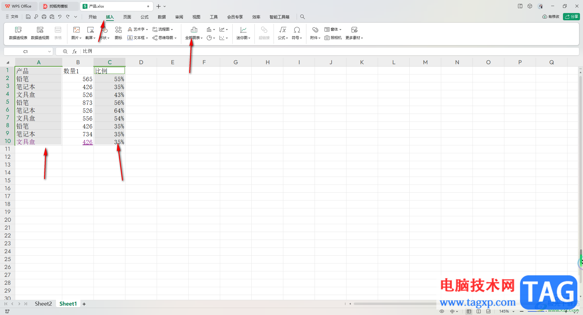 2.将产品和比例那一列的数据进行选中,按下Ctrl+鼠标左键依次框选即可将这两列数据选中,之后点击【插入】-【全部图表】。
