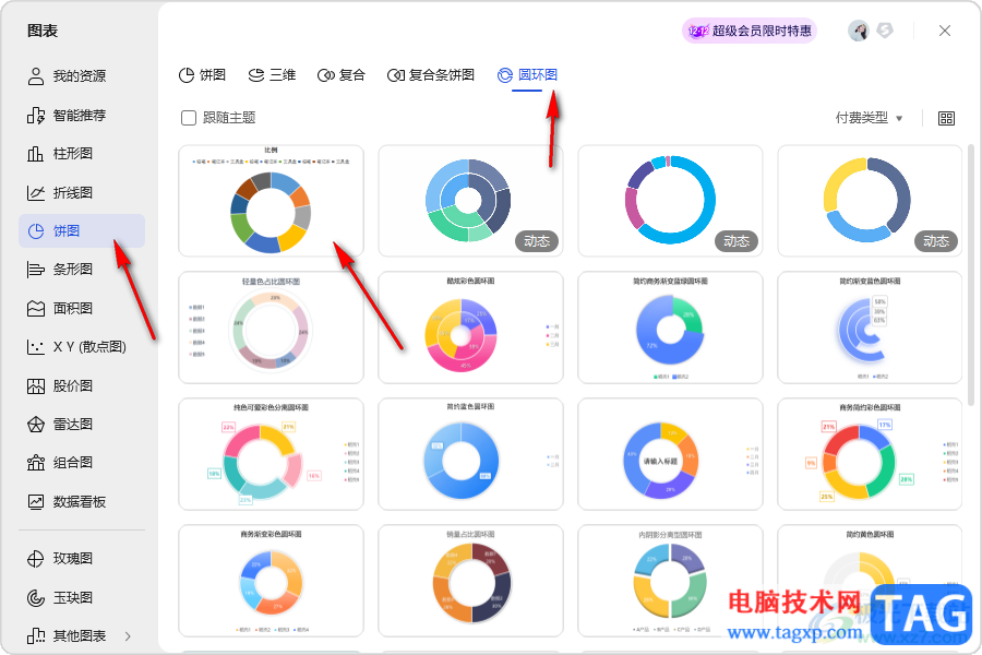 3.这时,我们在打开的页面上,将左侧的【饼图】点击一下,之后在页面的右侧将【圆环图】选项进行点击。