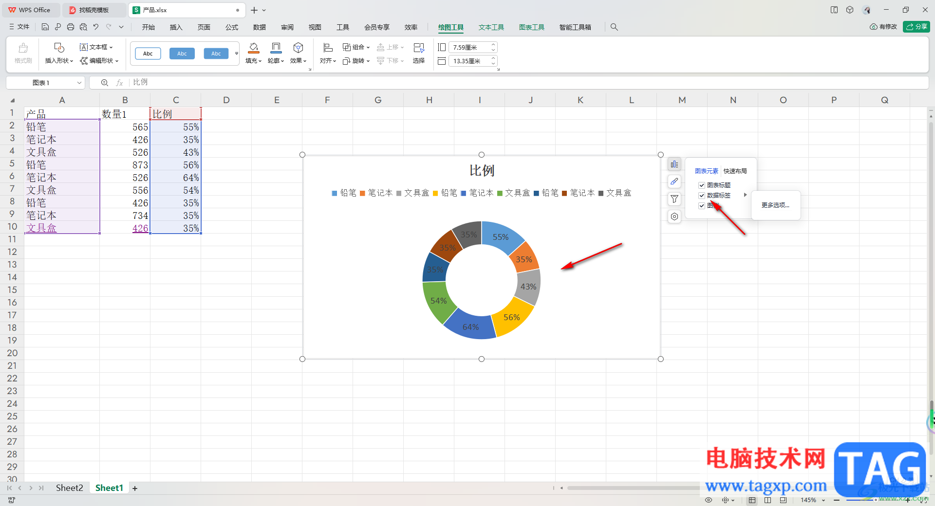 4.这时我们想要的圆环图即可插入到表格中,你可以点击该图表右侧的第一个图标,如图所示。